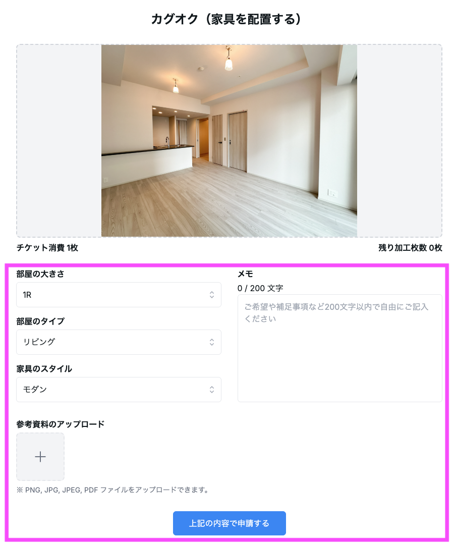 カグオクの導入にあたって、特別なシステムやアプリのインストールは一切不要。専用のフォームから物件写真をアップロードするだけで、あとは自動で高品質なステージング画像が仕上がります。
