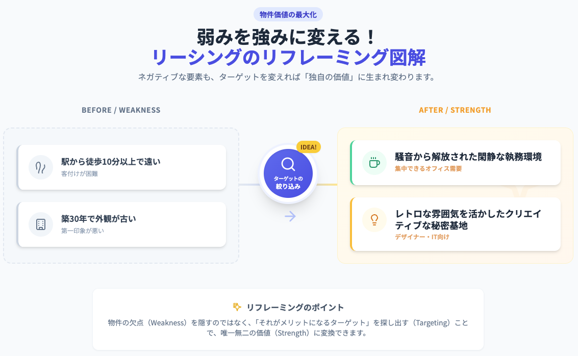 こうした市場環境において、ただ空室情報を公開して待つだけの「守りのリーシング」では、競合物件にテナントを奪われかねません。今、求められているのは以下の3つの視点を持った「攻め」のリーシングです。