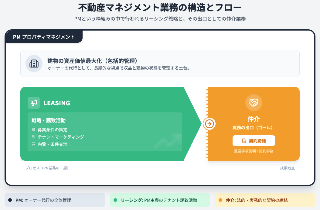 リーシング、あるいは「リーシングマネジメント(LM)」は、物件を一つの「商品」と捉え、いかに市場価値を高めて優良なテナントを誘致するかという経営・マーケティング戦略を担います。