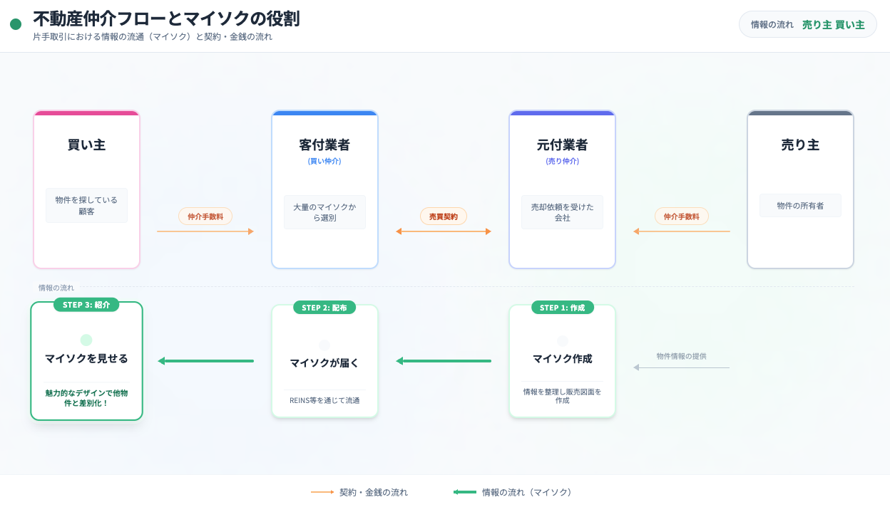 マイソクとは、主に売主側の不動産会社(=元付け業者)が買主側の仲介業者に配布する営業資料です。仲介業者は多数のマイソクを持っており、その中からお客様の条件にあった物件を紹介します。